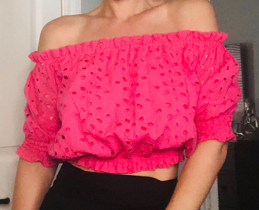 Azalea Pink Eyelet Off Shoulder Crop Top