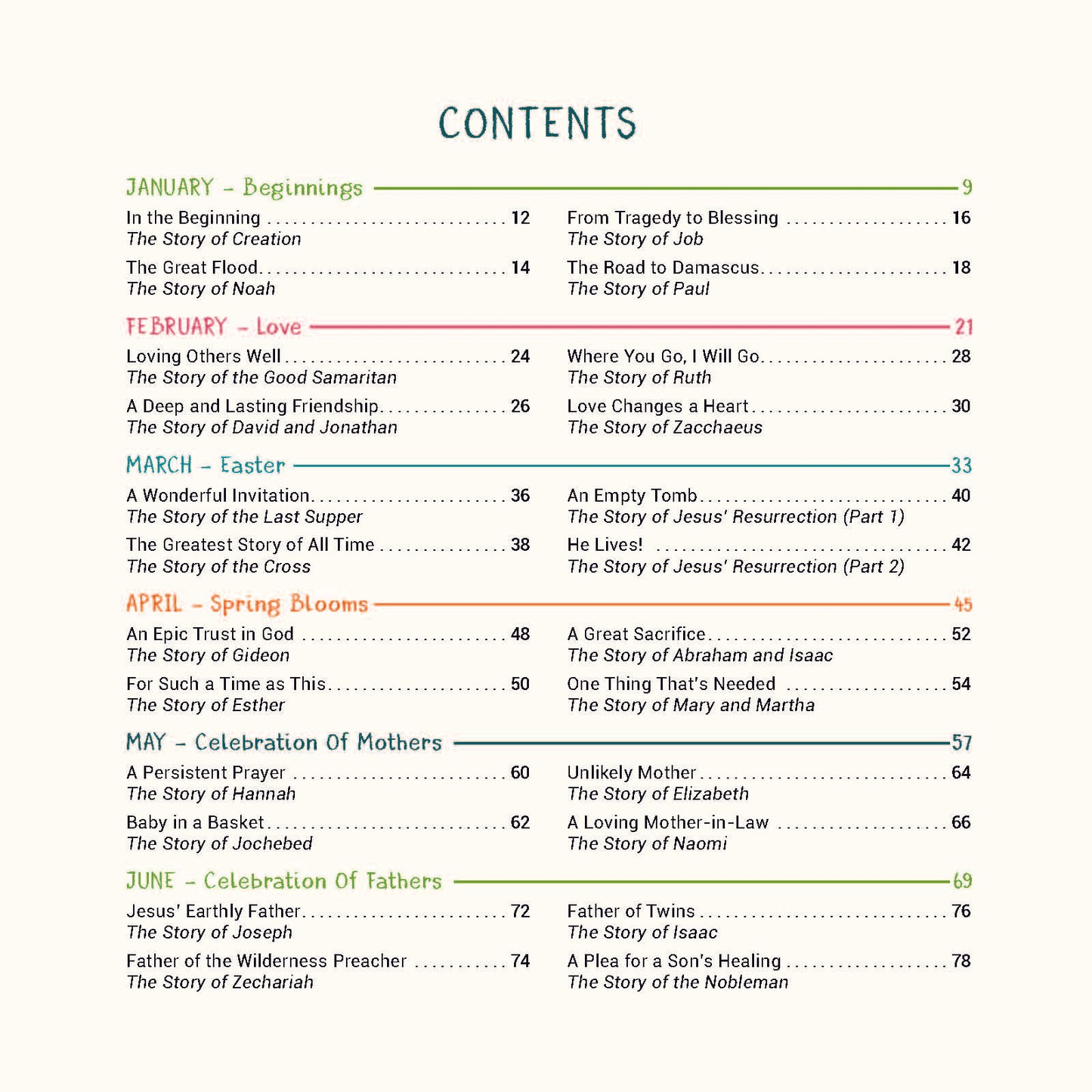 The stories are arranged into monthly themes that relate to a specific month of the calendar year: