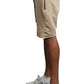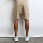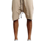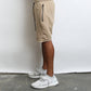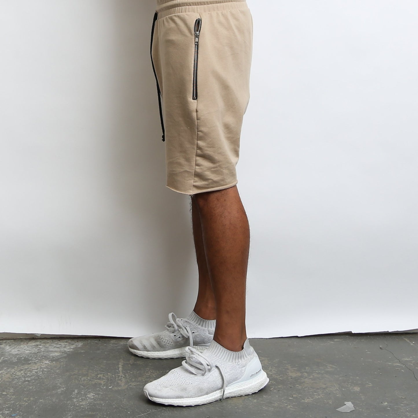 Drawstring enclosure at the waist, zip pockets, and a raw hem